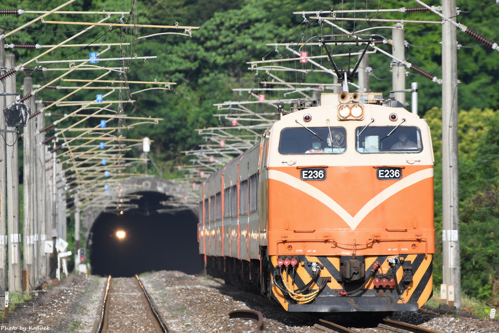 (7)南澳南的點,剛架好梯子,車就出現。正班莒光車走的是西正線,後方隧道內的頭燈是走東正線的貨列,兩者雙單運行,貨列應該是在隧道內被超車的吧。