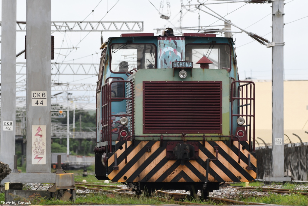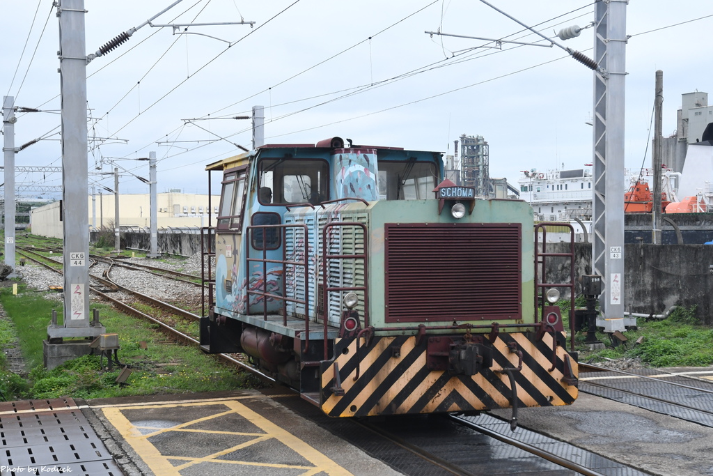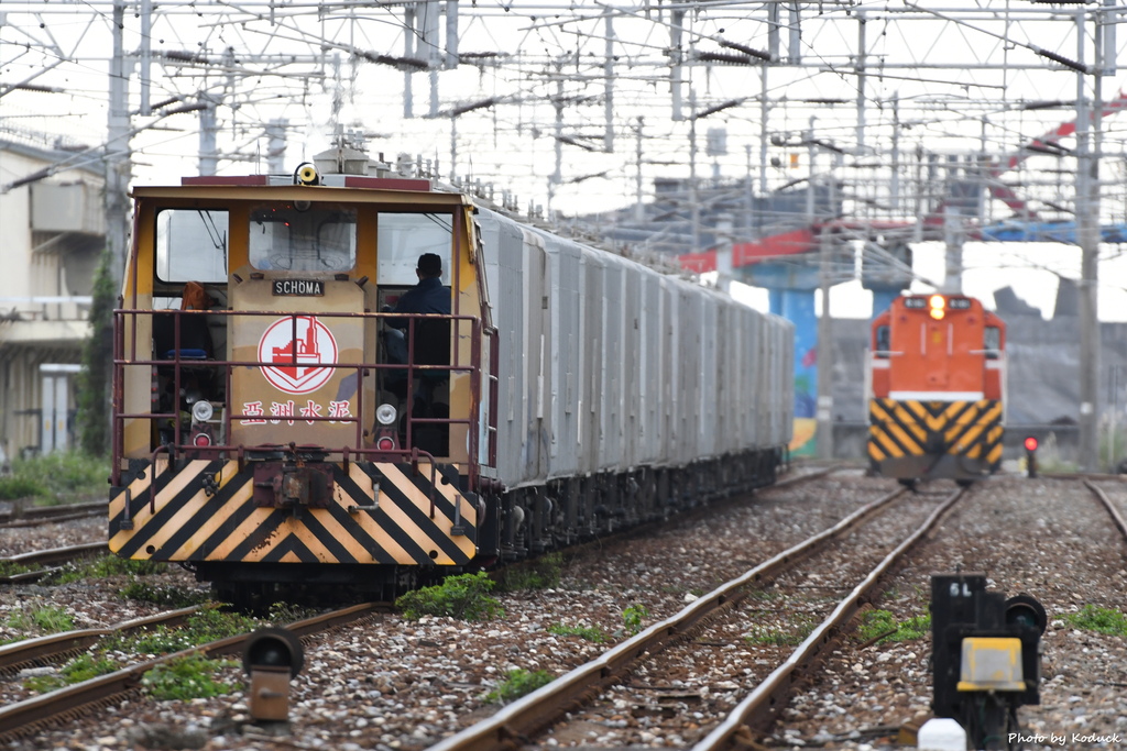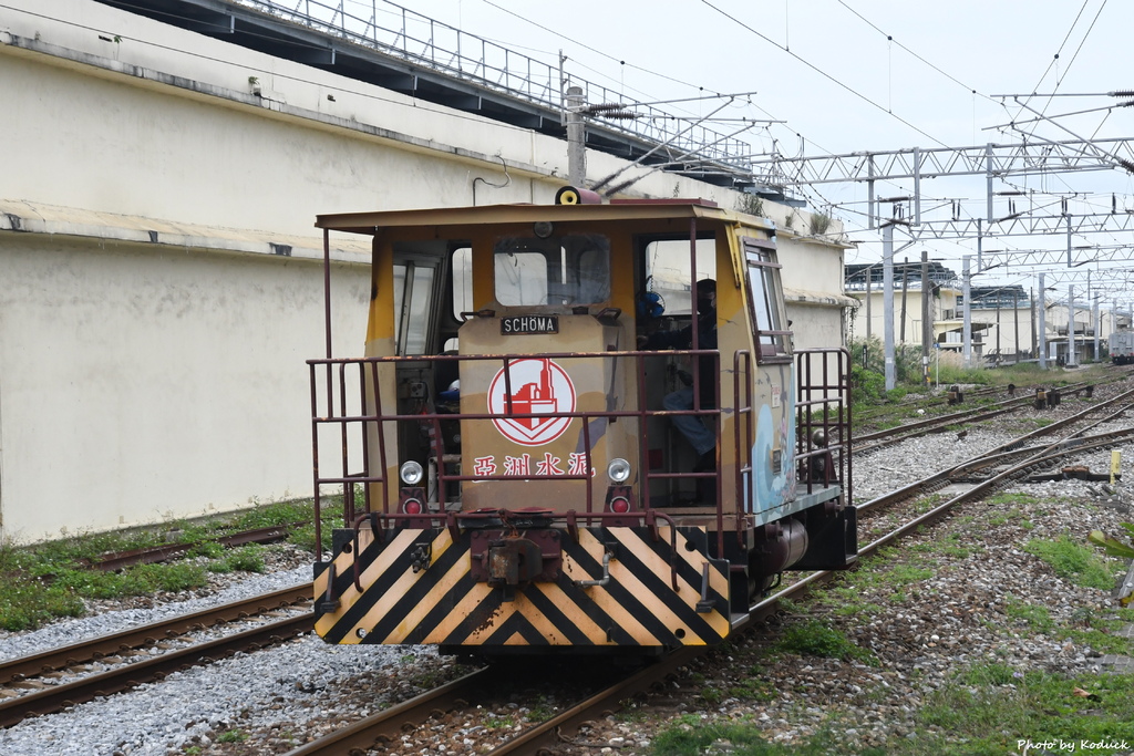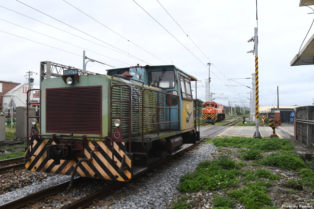 (2)推著調度的車廂,緩緩進入花蓮港線內。就是這部亞洲水泥的調車機有狀況,才會安排右側的柴電進來花蓮港線支援。