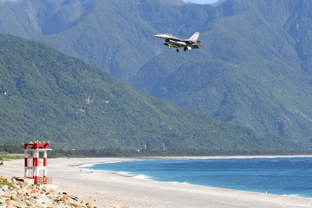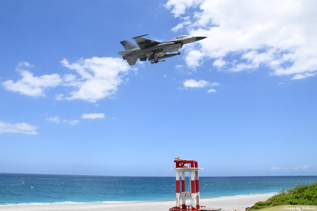 (39)又回到海邊,再換個位置拍,準備降落的戰機開始對正跑道,後方還有一架F-16也緊跟著準備降落。