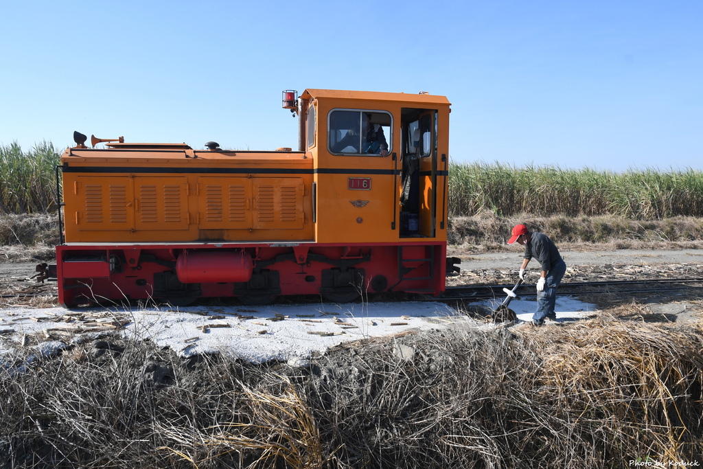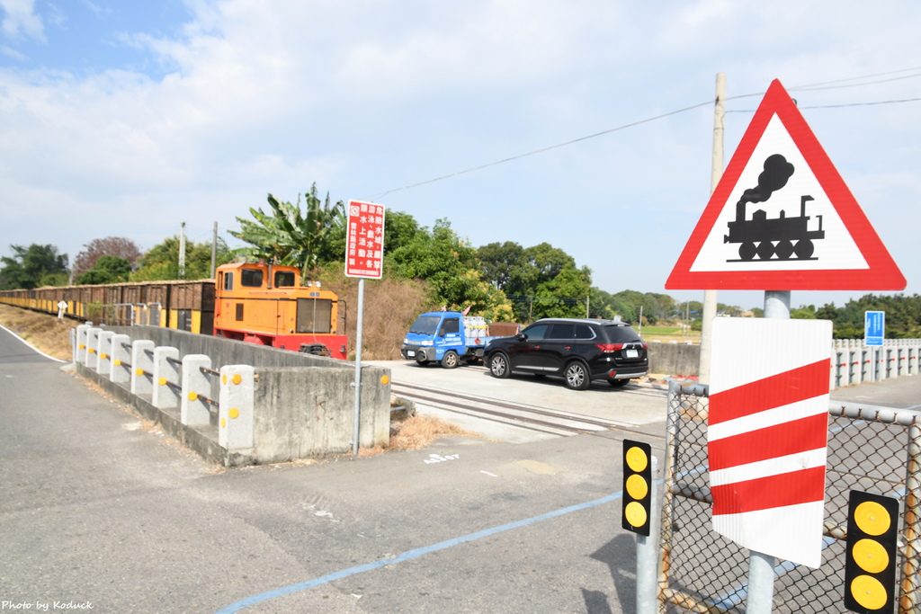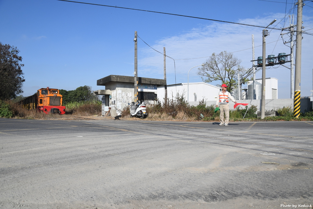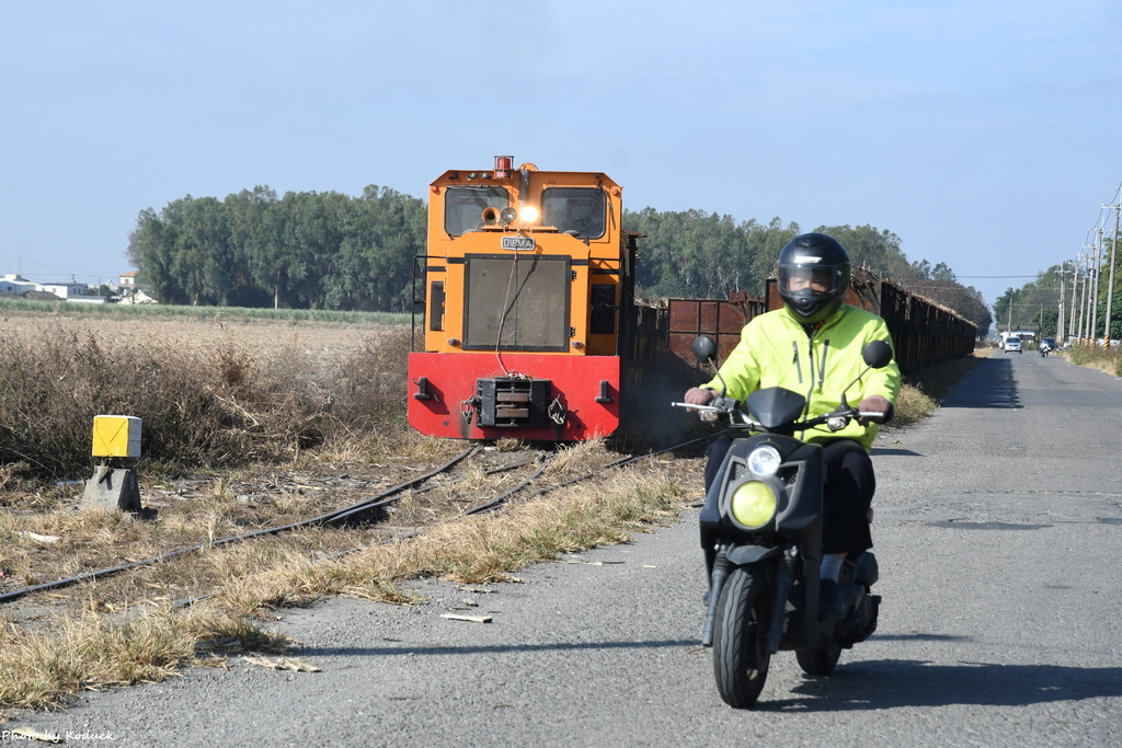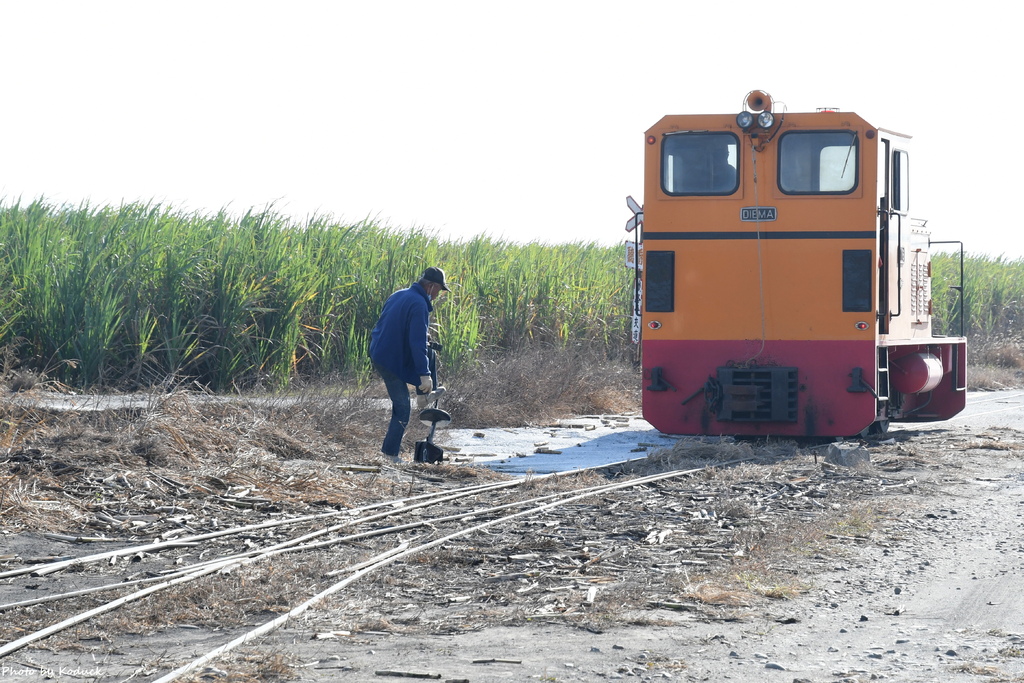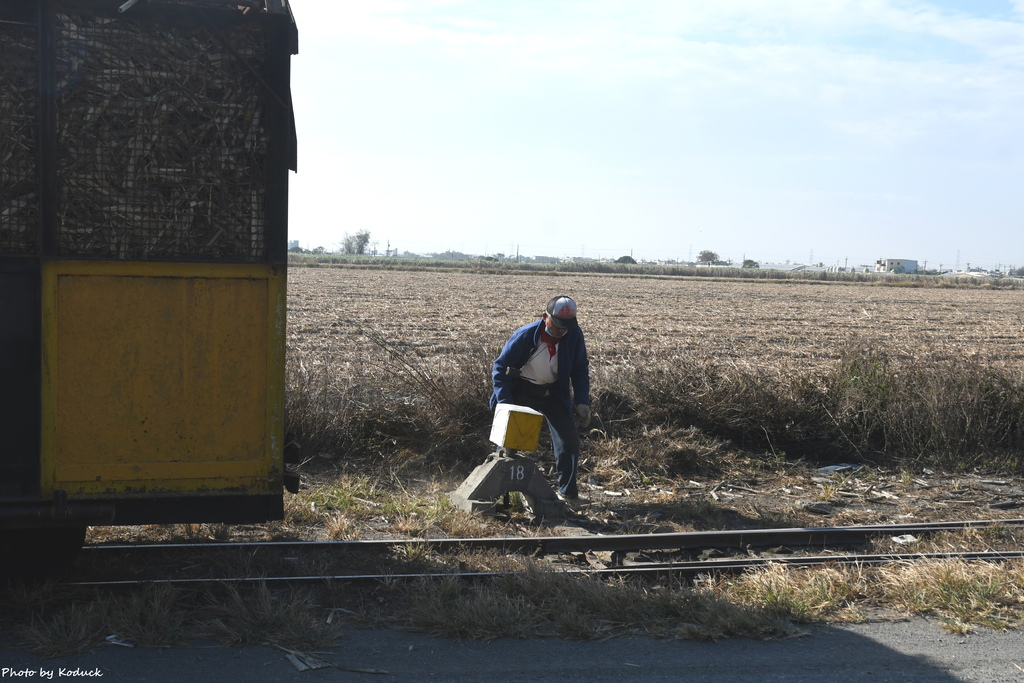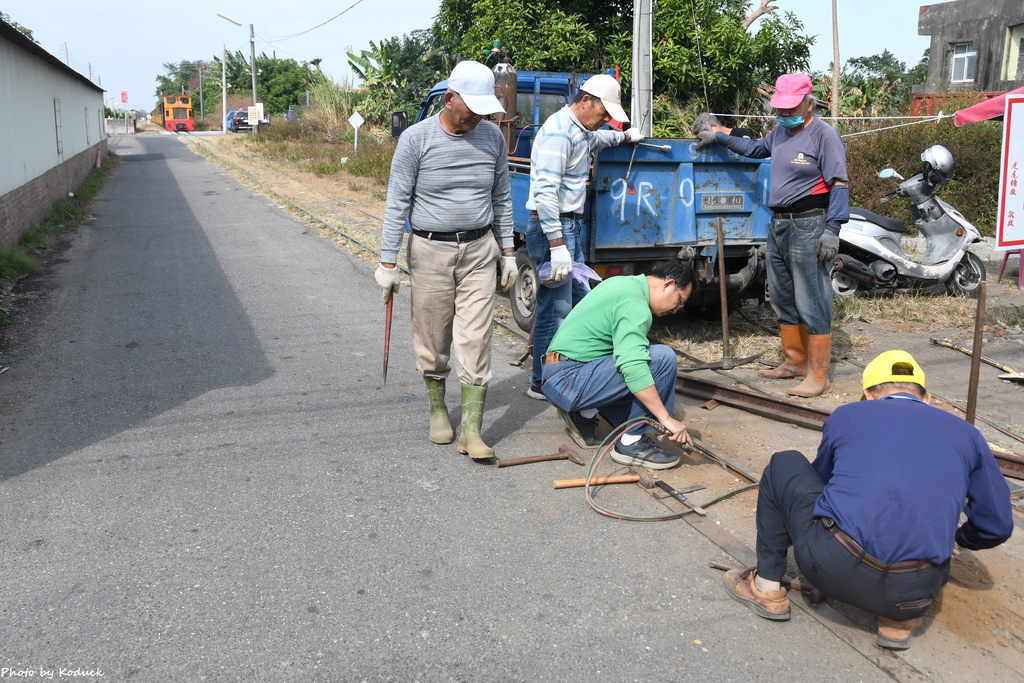 這趟來還巧遇軌道出現斷裂,糖鐵施工單位到路線上進行補修作業,單線作業的糖鐵只能暫停運作。原本計畫要拍的車次當然全數大亂,少拍好多班車。這也沒辦法,有時就是會出現這種意料之外的事,這也旅程多了點變化,拍到平常少拍的畫面。在等待的同時,與看柵工聊天,閒話一番。有些看柵工並不是為了薪水高低而過來,只是為了人情而過來幫忙,老朋友老鄰居拜託一句,就答應下來。這份工作薪水不高、看似輕鬆,不過還是有些許壓力在,畢竟不少用路人是真的沒在注意路況的。糖運列車雖然速度不快,但是列車夠長夠重,遇到狀況要煞停並不是那麼容易,還是只能期待其他用路人能夠遵守一下交通規則,避免意外發生。