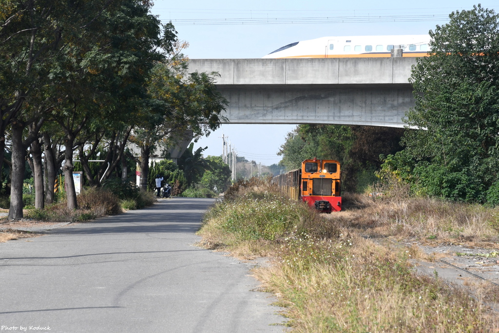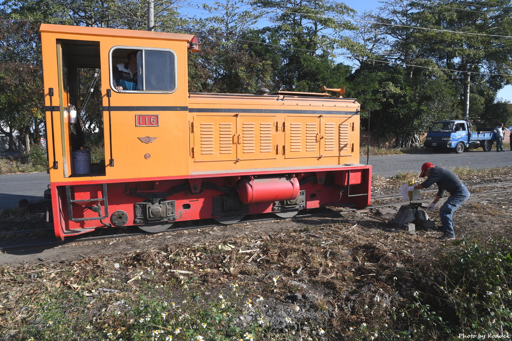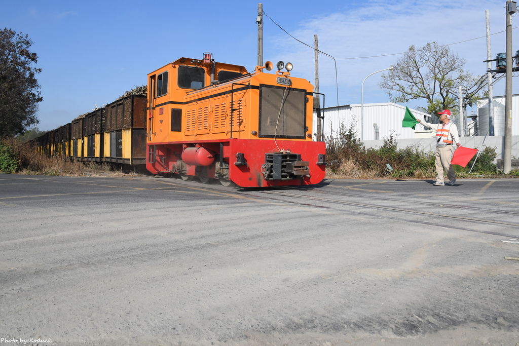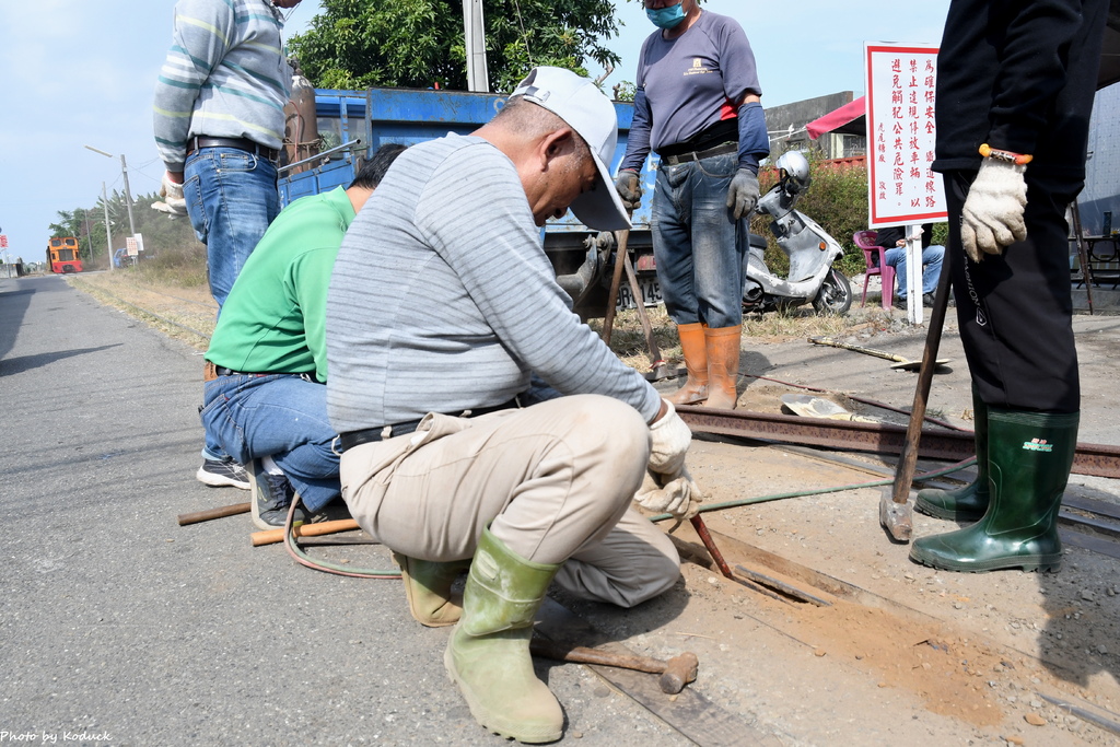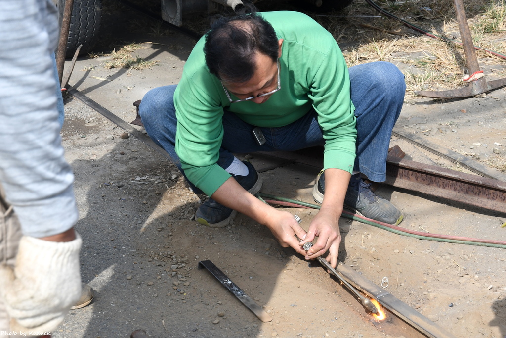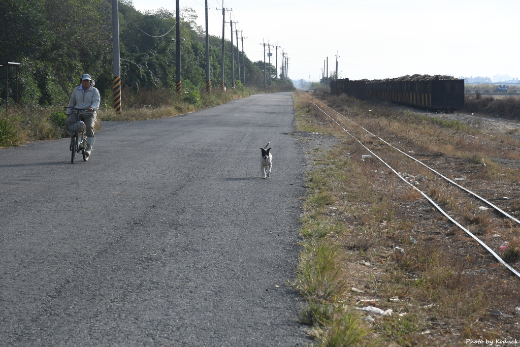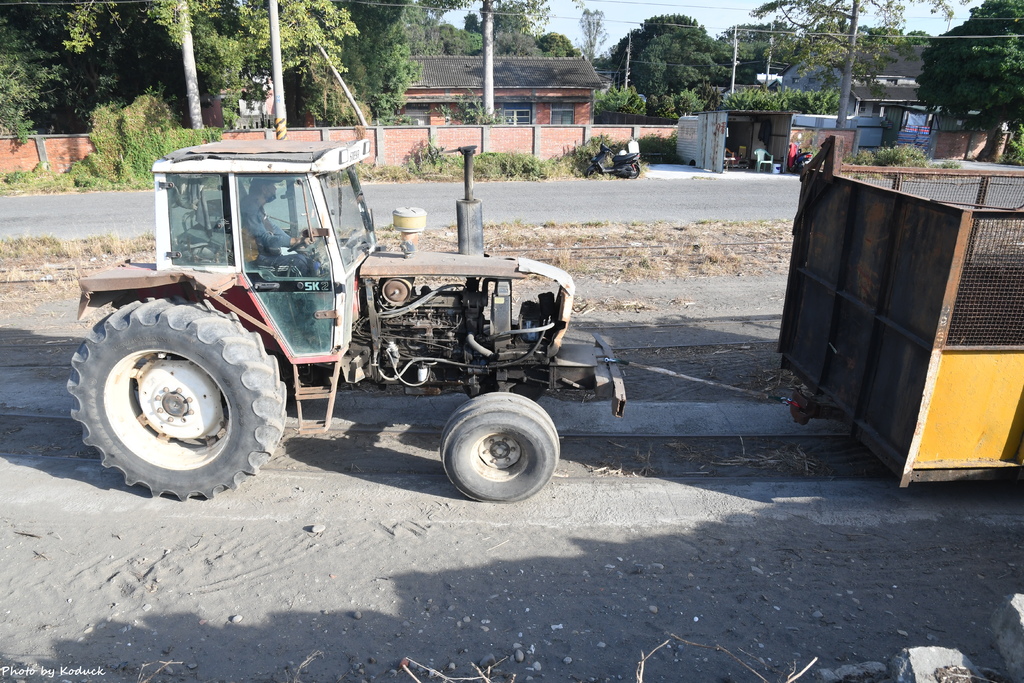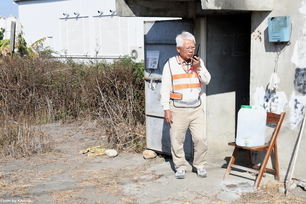 這趟來還巧遇軌道出現斷裂,糖鐵施工單位到路線上進行補修作業,單線作業的糖鐵只能暫停運作。原本計畫要拍的車次當然全數大亂,少拍好多班車。這也沒辦法,有時就是會出現這種意料之外的事,這也旅程多了點變化,拍到平常少拍的畫面。在等待的同時,與看柵工聊天,閒話一番。有些看柵工並不是為了薪水高低而過來,只是為了人情而過來幫忙,老朋友老鄰居拜託一句,就答應下來。這份工作薪水不高、看似輕鬆,不過還是有些許壓力在,畢竟不少用路人是真的沒在注意路況的。糖運列車雖然速度不快,但是列車夠長夠重,遇到狀況要煞停並不是那麼容易,還是只能期待其他用路人能夠遵守一下交通規則,避免意外發生。