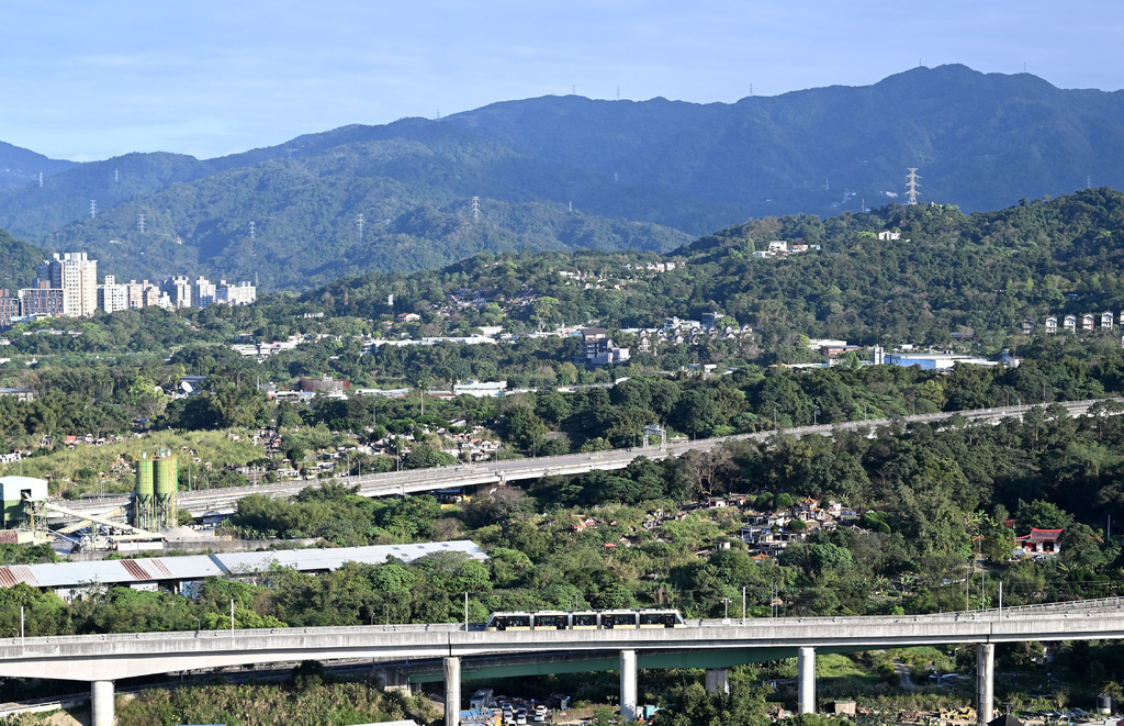 高架段的輕軌列車,準備由山坡走至平地,背景是安坑地區的山坡景象。早期因為無城市規劃,加上安坑部分地區禁建,使得山坡地的開發與運用顯得相當雜亂,未來已經有規劃重新進行土地利用,但付出的成本恐怕又是一個要傷腦筋的地方。