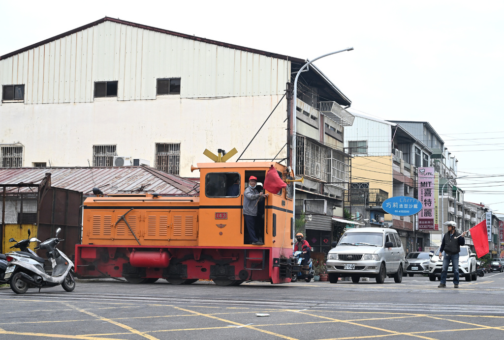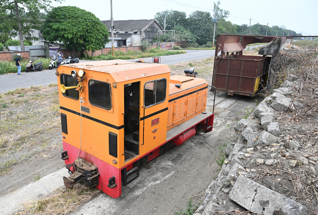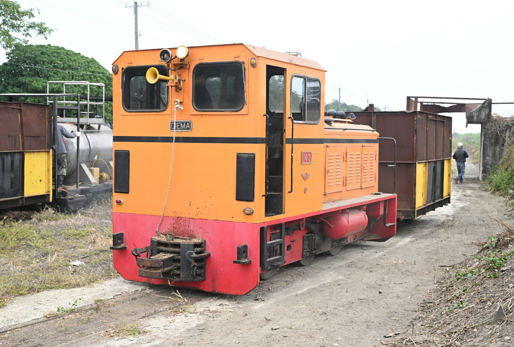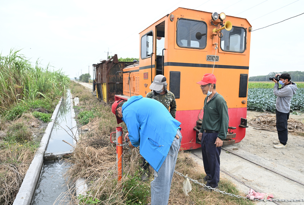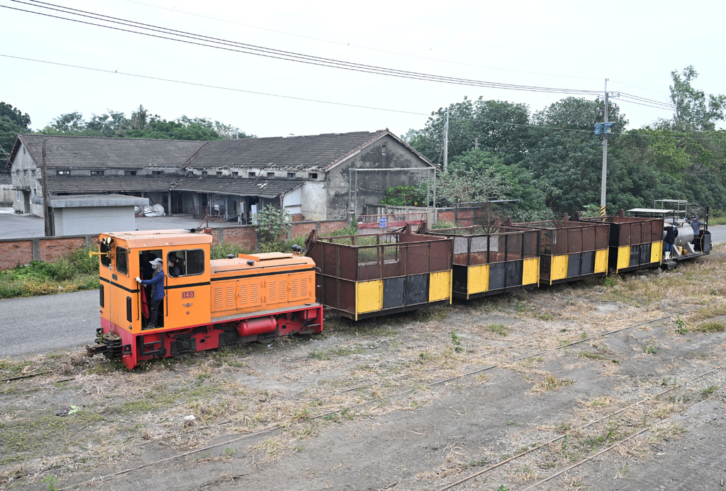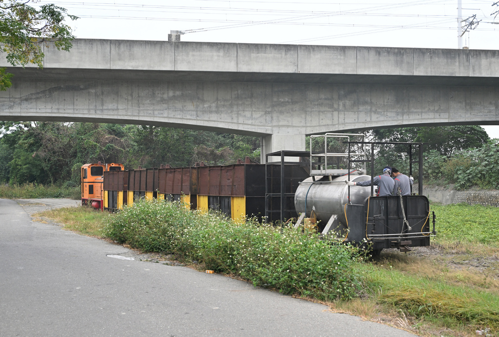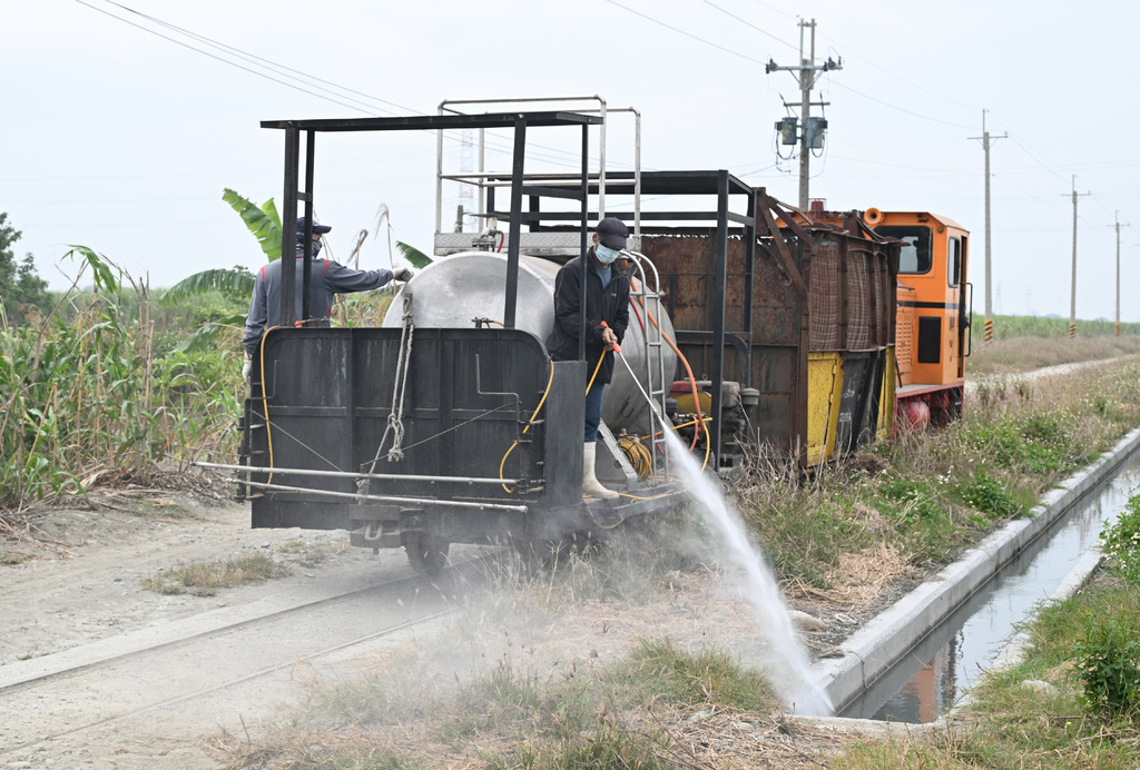比預計的時間早出發,而且順便帶著四個空蔗廂車要前往集蔗場停放,所以運轉的速度與時間都拖得比較長。因為是本季第一次出車,所以也算是邊走邊巡視,在市區的時候速度更是放到最慢,怕一般居民還不知道糖鐵軌道開始有車運行。到郊外也快不了多少,這班車也算帶著巡道的業務,仔細檢視著路線上的狀況。陸續放置好車廂,最尾端的除草作業也開始執行,利用噴槍噴灑藥劑,難得的畫面,當然要拍起來。