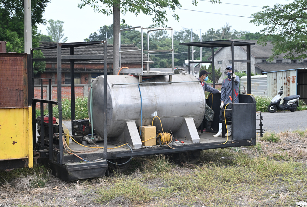 從四月到現在鐵道都沒用,荒蕪了大半年的鐵軌絕對要先整備,清理軌道上與兩旁的雜草絕對是首要工作,否則列車運轉到一半被雜草纏住動彈不得,豈不糟糕?路線邊已經有工作人員前往用機器除草,但還需要噴灑藥劑,完全抑制雜草生長,才更能確保運蔗列車安全運轉。記得之前在蒜頭糖廠還有看過改造的除草車,是真的安裝機械式工具來除草,不過虎尾糖廠似乎就沒有這種東西,還是用傳統的噴藥除草。