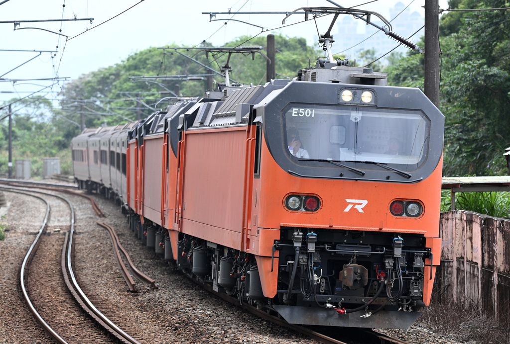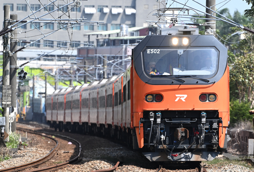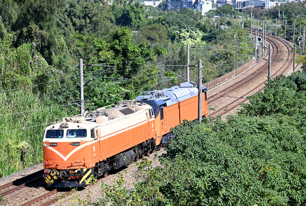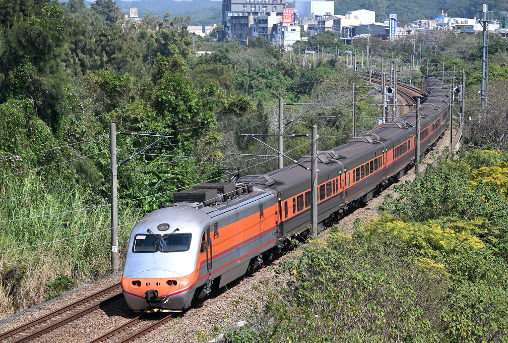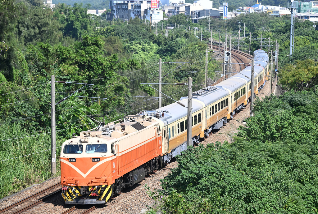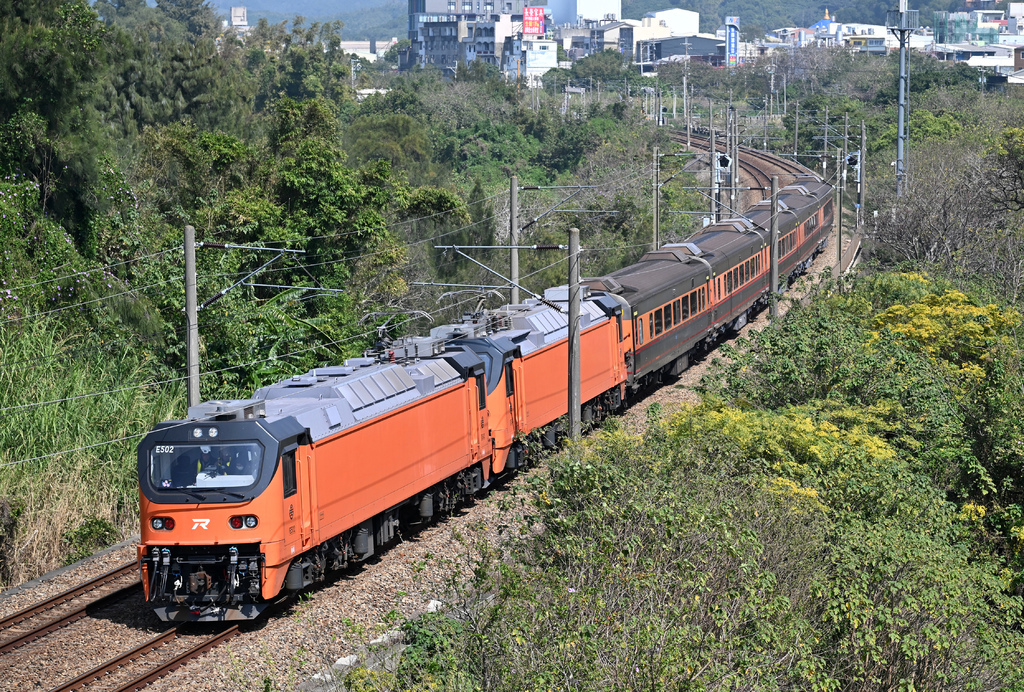 (15)E502牽引莒光號試運轉@山佳站北。這個組合也是挺特別,整個橘色的組合,該說塗裝很一致嗎?